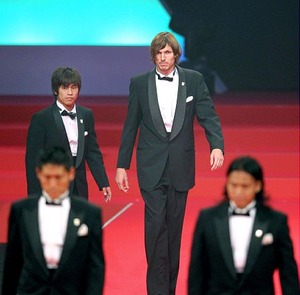「Jリーグアウォーズ」で初のベストイレブンを受賞し、花道を入場する甲府のハーフナー・マイク(後方左は吉田豊)