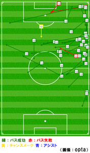 画像:opta(緑:パス成功、赤:パス失敗、黄:チャンスメーク、靑アシスト)