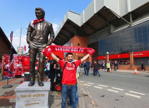 画像 アンフィールドの外に建てられたモイーズ像と記念撮影するリヴァプールファン [写真]=Getty Images