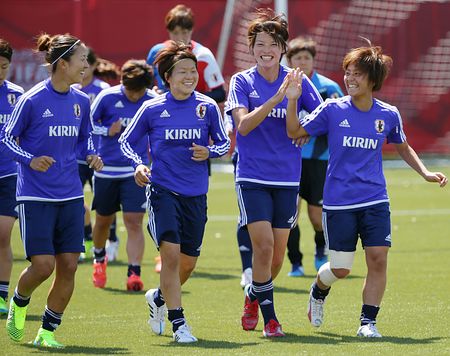 画像:決勝トーナメント1回戦に向けて笑顔で調整する(手前右から)岩渕、熊谷、宮間、大儀見=19日、カナダ・バンクーバー