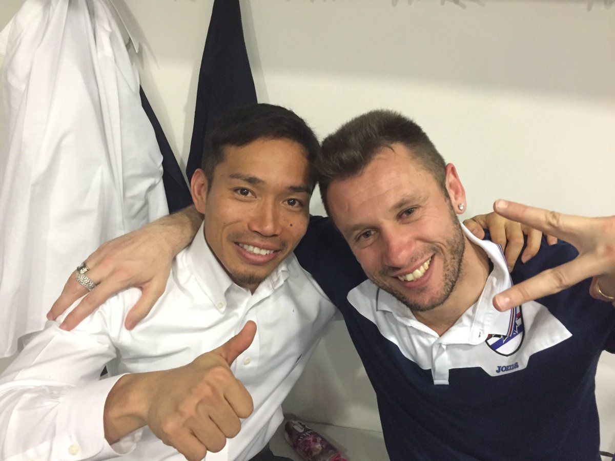 3-0で勝利した後、長友は自身のツイッターアカウントで「今日はチームの勝利と親友カッサーノに会えて最高の一日だった。