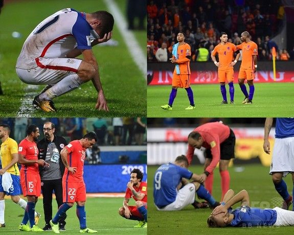 2018年サッカーW杯ロシア大会出場を逃し落胆する(左上から時計回りで)米国、オランダ、イタリア、チリ代表の選手(2017年11月15日作成)。【翻訳編集】 AFPBB News