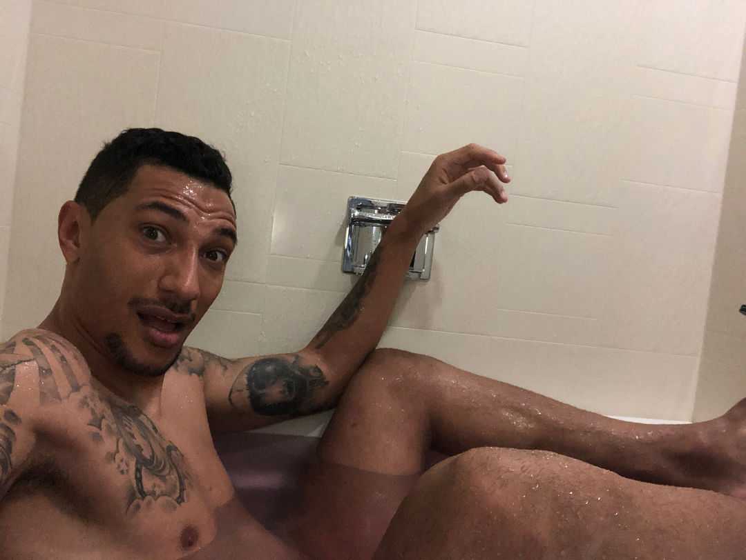 遠征先とされるホテルの一室に備え付けられたバスに窮屈そうに浸かる自身の姿をアップし、次のように嘆いた。