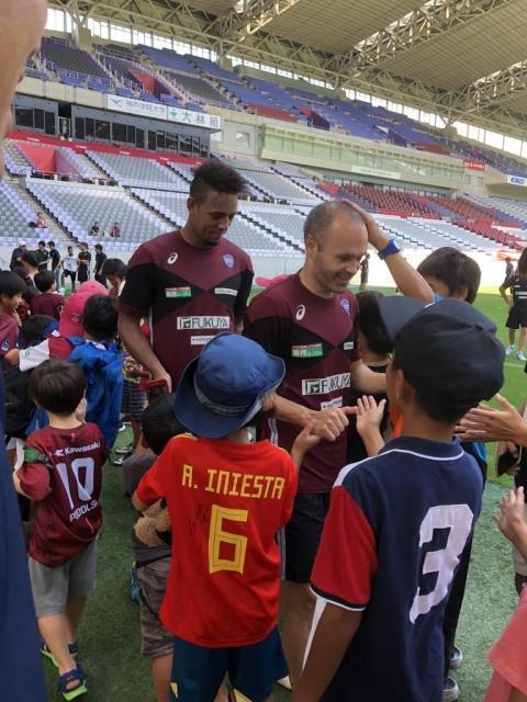 子どもの一人がイニエスタの頭にタッチするいたずらを仕掛けたが、大スターは笑顔で“神対応”。
