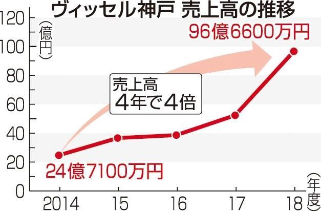 サッカーJリーグ1部(J1)のヴィッセル神戸は、元スペイン代表MFアンドレス・イニエスタ選手(35)が加入した2018年度、営業収益(売上高)が日本のプロサッカー史上最高額の96億6600万円を記録した。