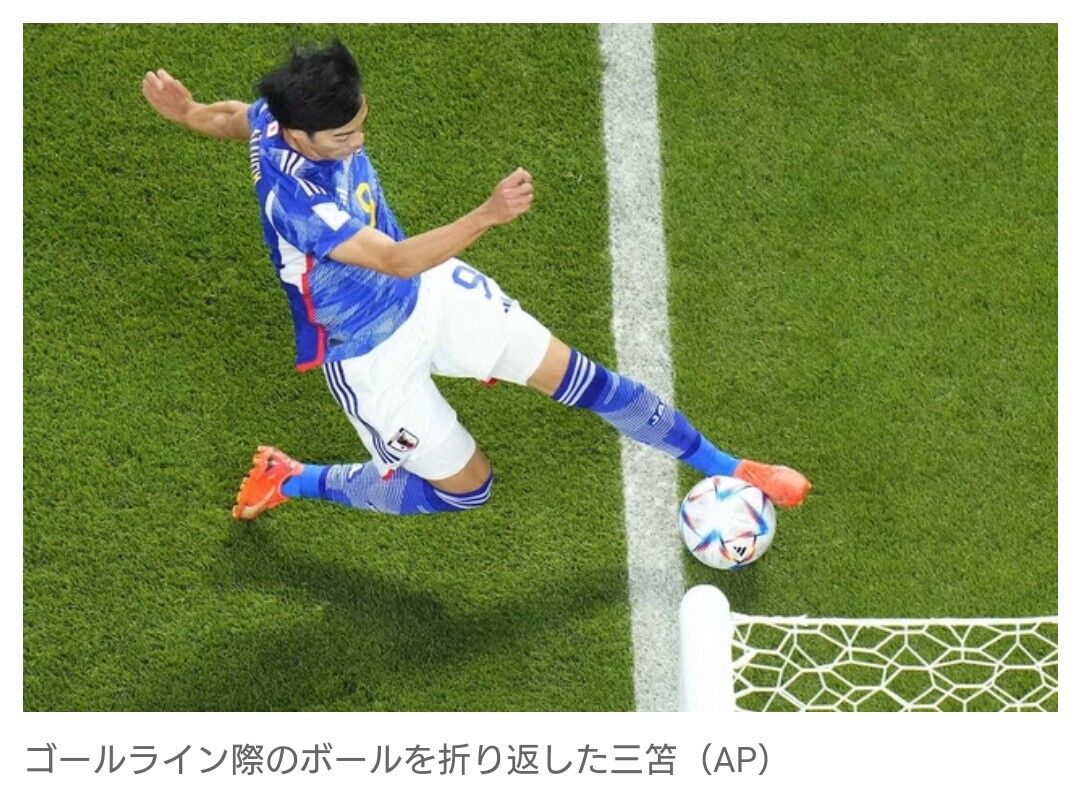 日本代表のMF三笘薫はスペイン戦で1―1の後半6分、左サイドから折り返してMF田中碧の勝ち越しゴールをアシスト。あきらめずに走り込み、エンドラインぎりぎりで足を伸ばした三笘のプレーは“三笘の1ミリ”と称賛を浴びた。試合ではビデオ・アシスタント・レフェリー(VAR)の映像で、ボールが線上に残っていることが証明され、得点が認められた。